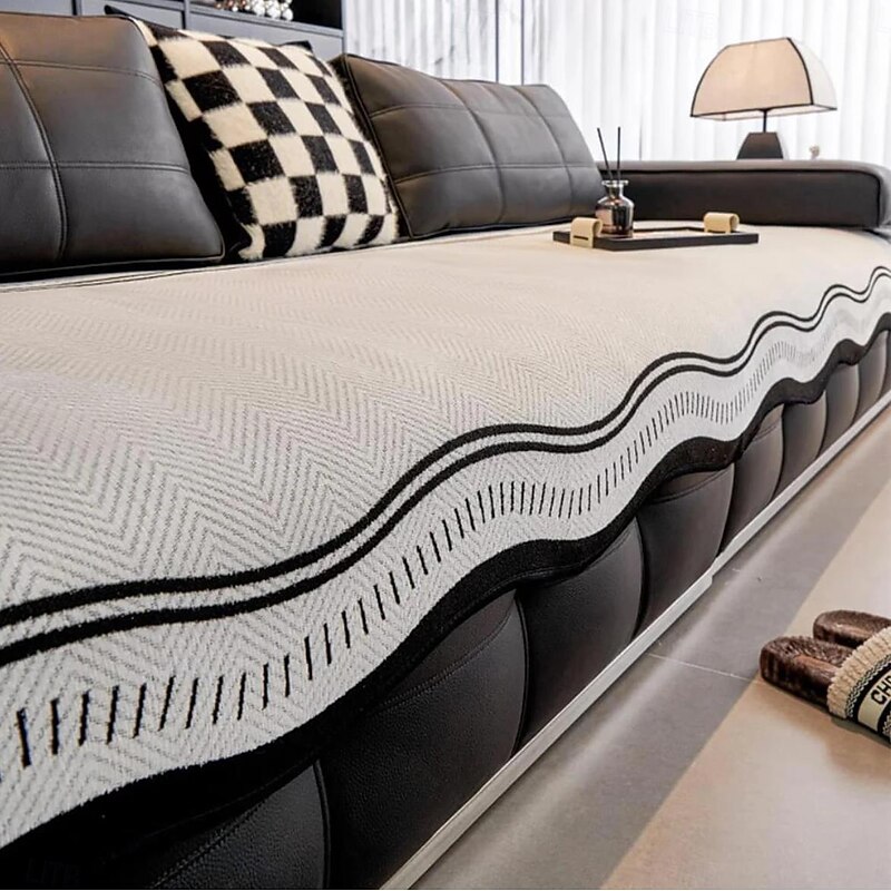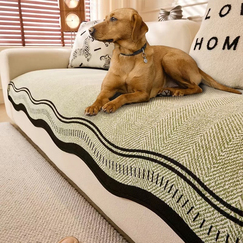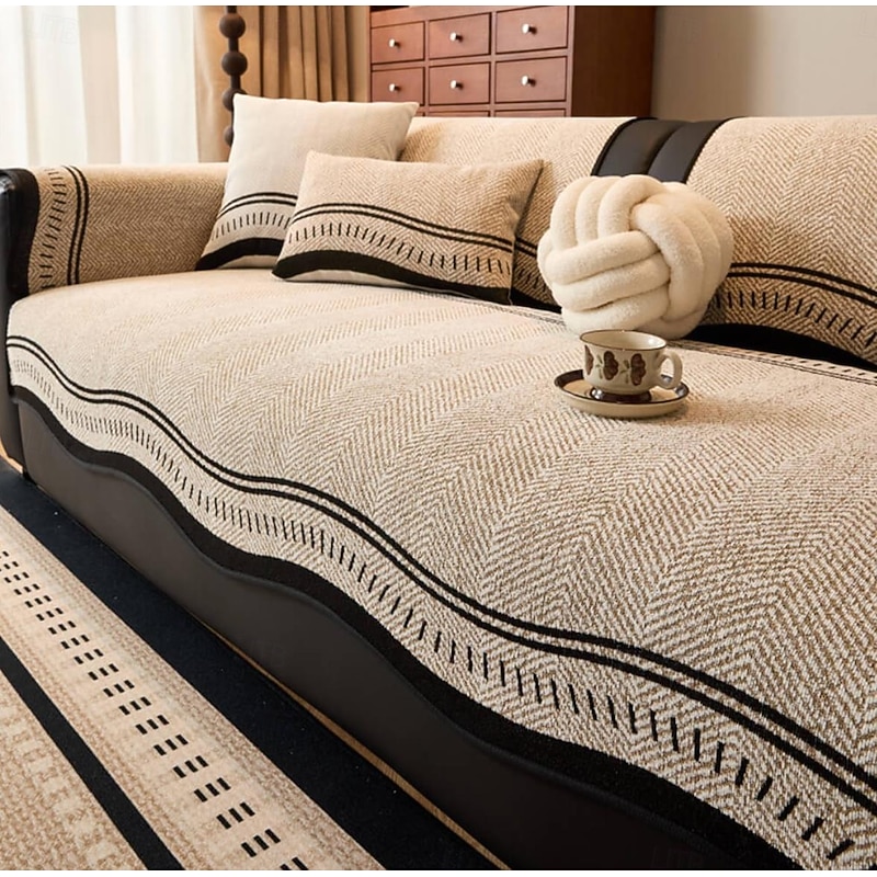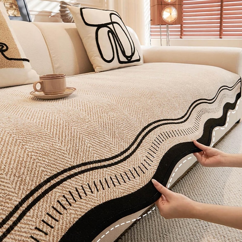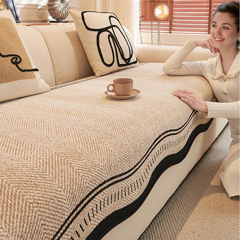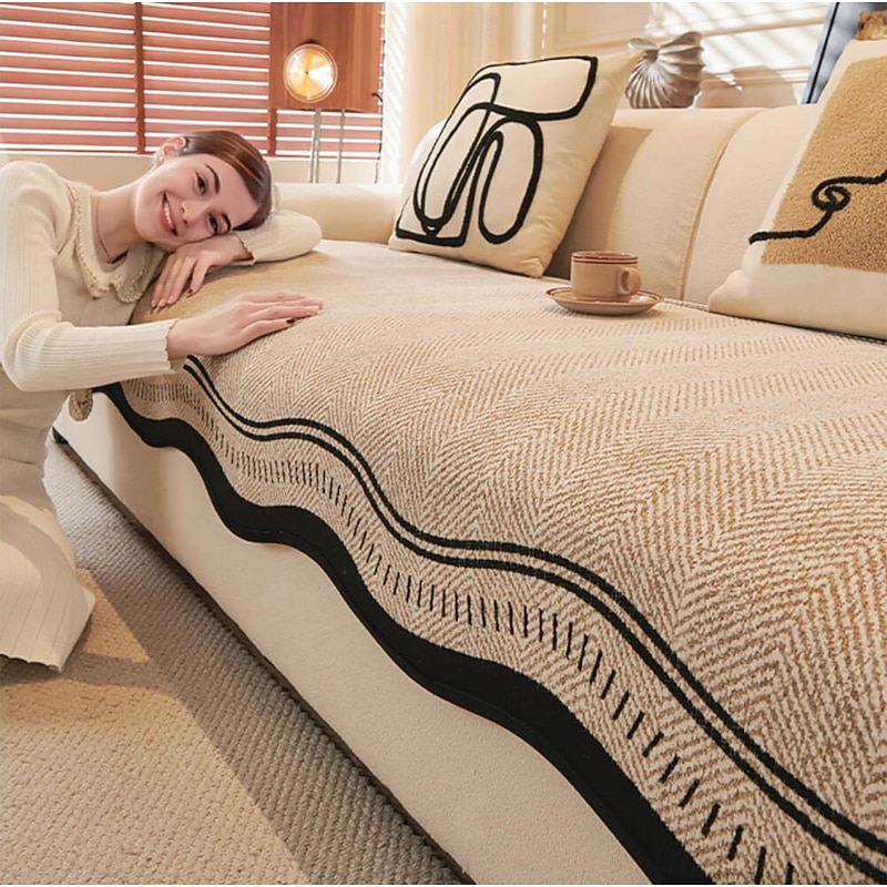 HOT ! Non-Slip Sofa Cover Herringbone Chenille Couch Cover with Wavy Edges Pet Friendly