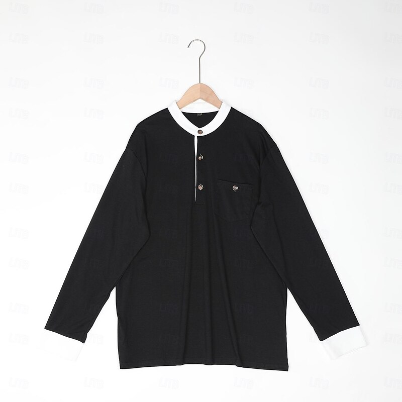 Men's Henley Shirt Tee Top Cotton Blend T-Shirt Long Sleeve Color Block Solid Fashion Designer Basic Patchwork Stand Collar Henley Vacation Street Casual Spring &  Fall All Seasons Black Navy Blue 15
