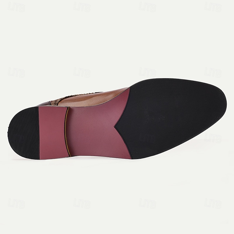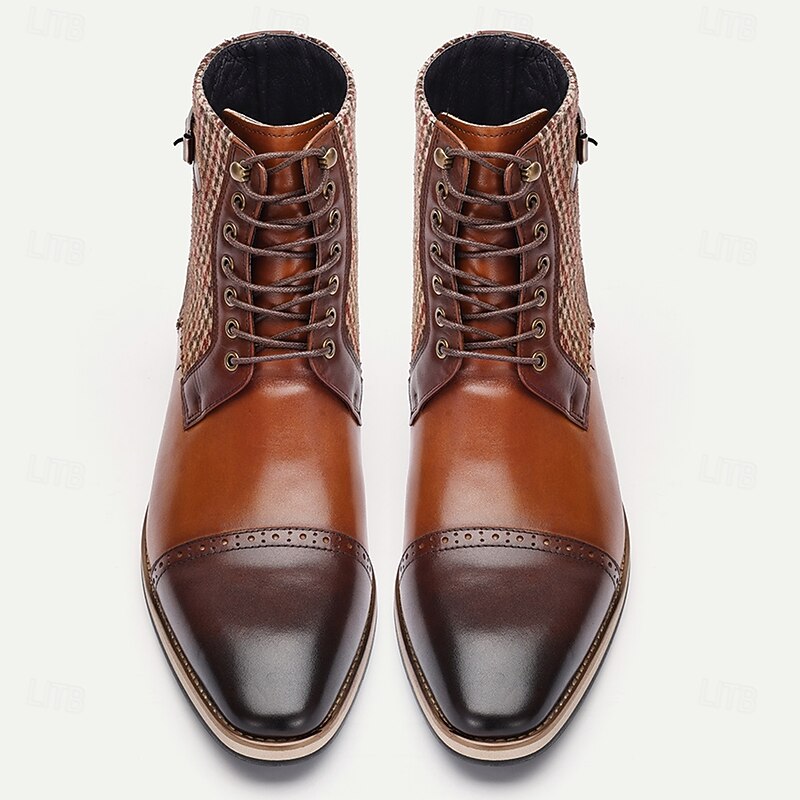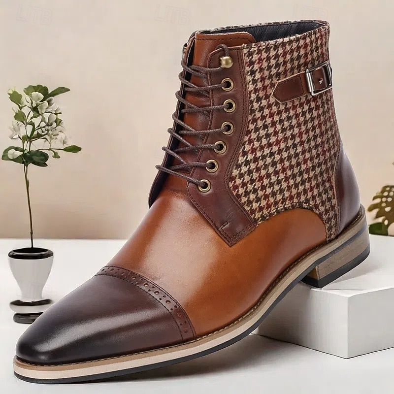Highlights [Cowhide Construction] Expertly crafted from 100% premium cowhide leather, these men's ankle boots offer a luxurious feel and durable wear. The rich brown hue with a polished finish enhances the sophisticated look of this enduring footwear piece. [Refined Silhouette] The sleek cap toe design in combination with a round toe shape provides a timeless and elegant style suitable for various occasions. [Design Highlights] Featuring a decorative buckle strap that complements the lace-up front, these boots integrate a chic houndstooth pattern on the sides for a touch of vintage flair. The sturdy rubber outsole ensures reliable traction and slip resistance. [Versatile Occasions] Perfect for both formal and casual settings, these boots are versatile enough to be worn to work, social gatherings, and everyday outings during the fall and winter seasons. [Size Range] Available in a comprehensive size range from US6 to US13, these boots are suitable for a broad audience, ensuring a snug fit for everyone.