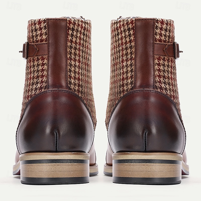 Men's Premium Cowhide Leather Ankle Boots – Vintage Houndstooth Pattern with Buckle Detail, Stylish Dress Boots for Formal and Casual Wear 6