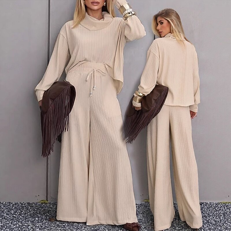 Women's Elegant Vintage Fashion Pants Sets Bolero Top Long Sleeve Turtleneck Solid Color Casual Daily Date Rose Gold White Champagne Fall Loose Fit 1