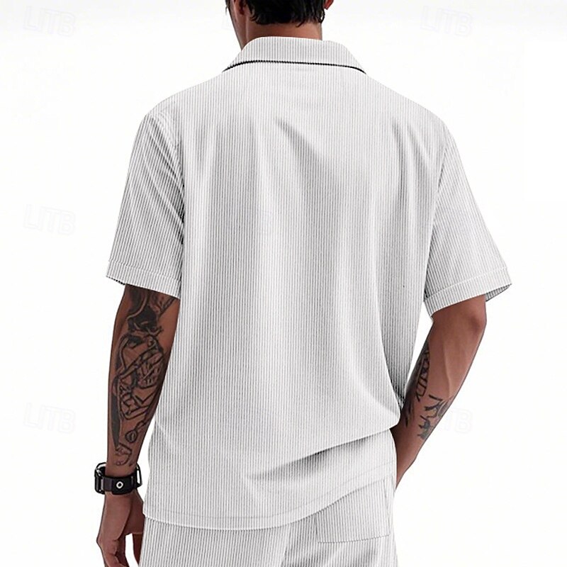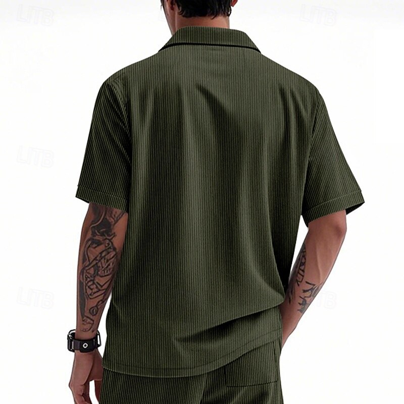 Highlights - Stay cool and stylish all summer long in this casual men's short sleeve shirt - Made from high-quality polyester fabric for comfort and durability - Perfect for vacation and leisurely outings - Features a trendy lapel neckline for added sophistication