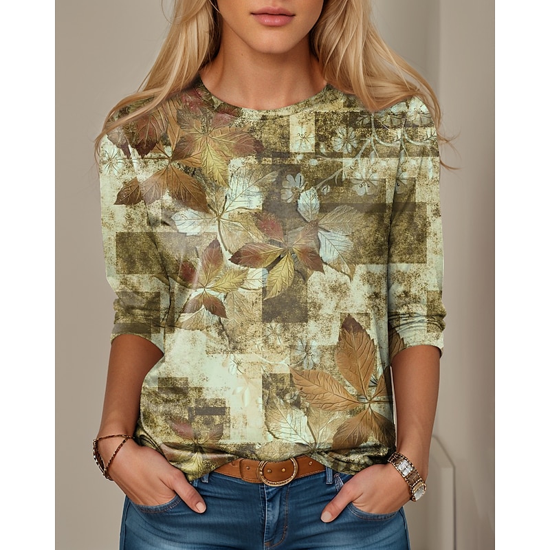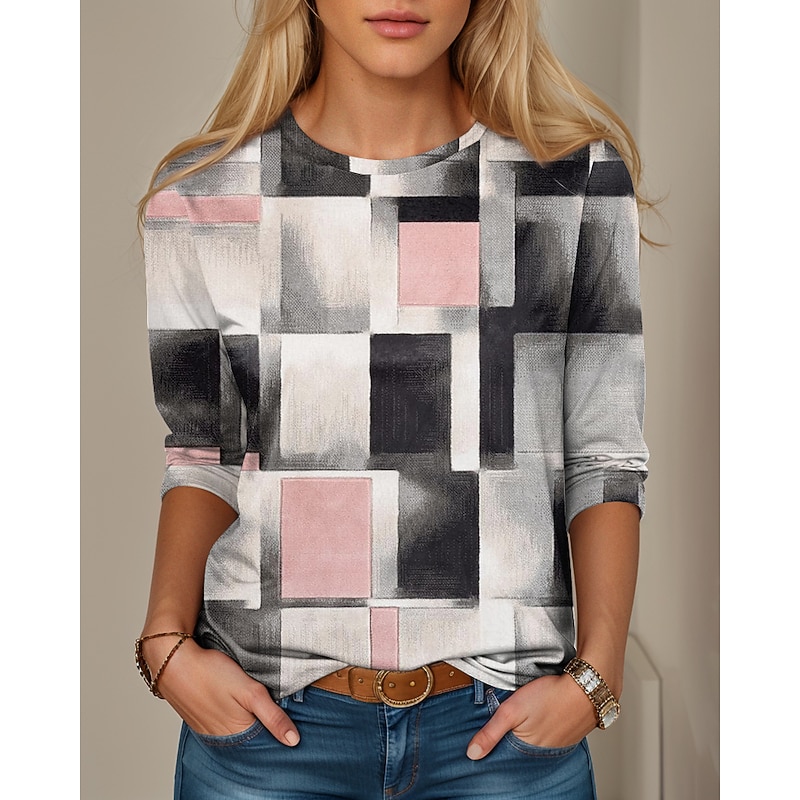 HOT ! Women's T shirt Crew Neck Long Sleeve Tunic Floral Geometric Plaid Print Regular Tops Round Neck Daily Weekend Pink Green Spring & Fall