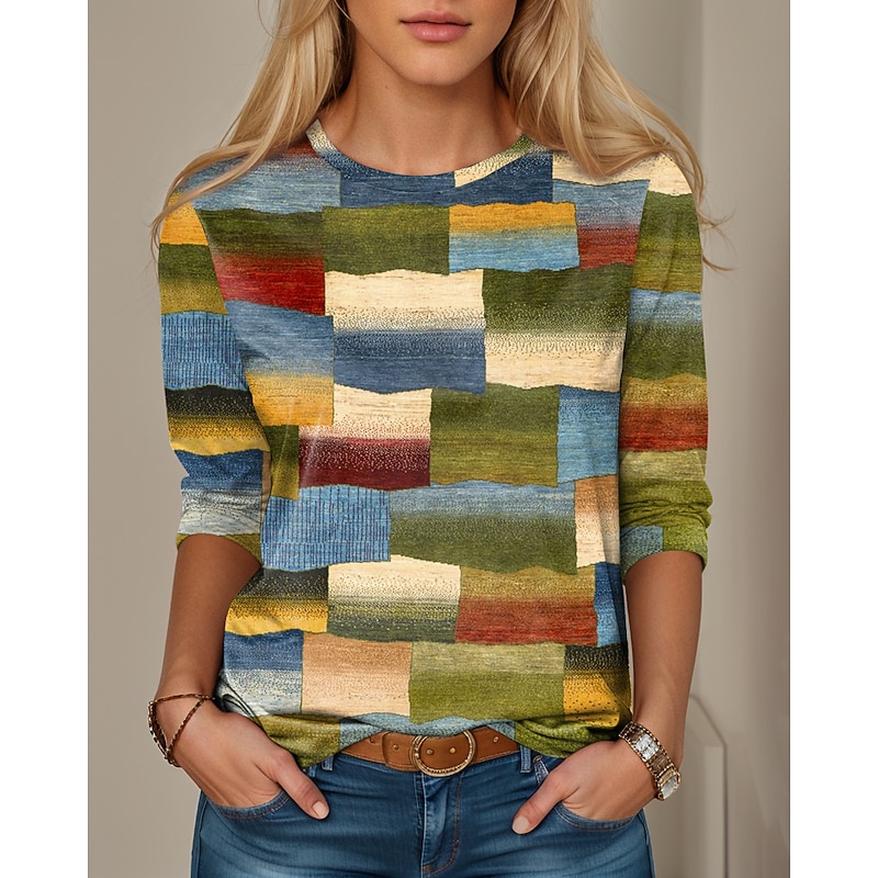 Highlights [Fabric] : Crafted from high-quality polyester, this women's long-sleeve T-shirt ensures a soft and comfortable wear with its micro-elastic properties. The fabric offers a smooth texture, perfect for everyday use during the spring and fall seasons. [Fit] : Designed with a regular fit, the top provides ease of movement and a relaxed style. The long sleeves and round neckline enhance its casual yet fashionable appeal, making it a versatile addition to any wardrobe. [Design Highlights] : This T-shirt features a vibrant 3D print of floral, geometric, and plaid patterns in a modern patchwork style. The combination of pink, blue, and purple hues creates a visually appealing design, while the round neck allows for easy accessorizing. [Occasions] : Ideal for daily wear, weekend gatherings, or casual outings, this top adds a splash of color and style to any ensemble. Whether you're heading out for a day with friends or enjoying a cozy stay-at-home day, this shirt delivers both comfort and elegance. [Size Range] : Available in a range of sizes from S to 2XL, this top is designed to suit various body types and offers the perfect fit for any occasion.