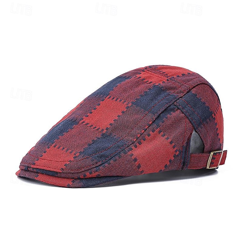 Highlights [Fabric] : Crafted from a high-quality polyester blend, this men's flat cap ensures breathability and comfort for all-day wear. The fabric's softness and durability make it a versatile choice for various weather conditions. [Fit] : The cap features a classic flat cap silhouette with a tailored structure that offers a flattering fit. An adjustable strap at the back with a sleek metal buckle allows for personalized size customization, ensuring a secure and comfortable fit. [Design Highlights] : Showcasing a bold checkered pattern in a combination of red and navy blue, this cap stands out with its vibrant, eye-catching appeal. Its sophisticated plaid design adds a touch of elegance, making it a standout accessory in any wardrobe. [Occasions] : Perfect for streetwear and daily outings, this flat cap is an ideal accessory to elevate casual and semi-formal ensembles. Whether strolling through the city or attending a relaxed gathering, it adds a distinctive flair to your look while offering practical sun protection. [Size] : Offered in one size with an adjustable strap to accommodate a variety of head sizes, this cap provides a snug and adaptable fit for most individuals. Available in multiple color options to suit diverse style preferences.