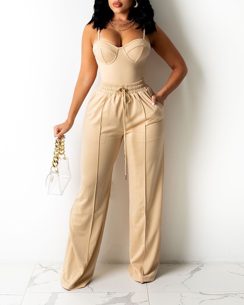 Toloer 2PCS Women Sexy Zipper Back Cami Top Wide Legs Contrast Pipping Long Pants Set Elegant Workwear Casual Two Piece Suits Ropa 2