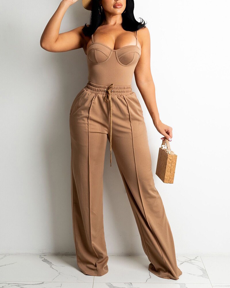 HOT ! Toloer 2PCS Women Sexy Zipper Back Cami Top Wide Legs Contrast Pipping Long Pants Set Elegant Workwear Casual Two Piece Suits Ropa
