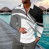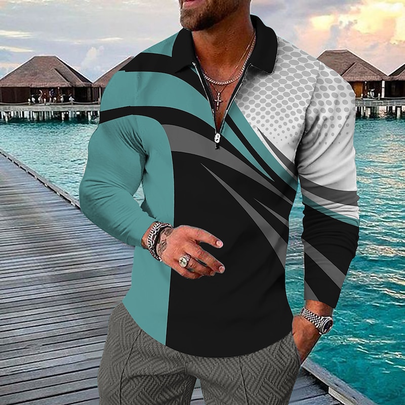 HOT ! Men's Geometric Hawaiian Polo Shirts Golf Shirt Long Sleeve Polo Shirts Collared Shirts Casual Beach Wear Vacation Wear Party Outfits 3D Print Quarter Zip Polo Red Blue Dusty Blue