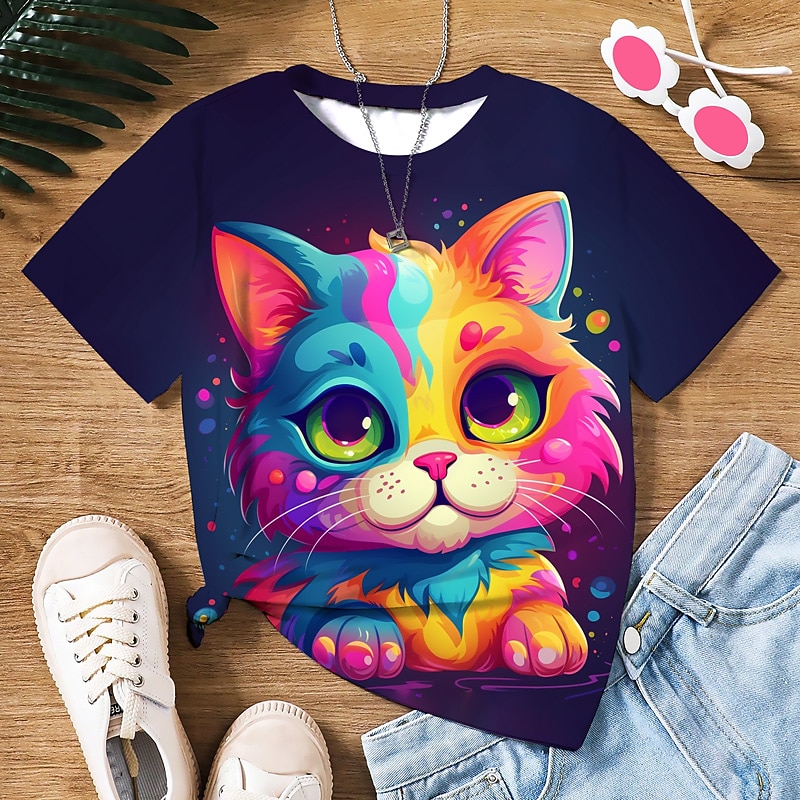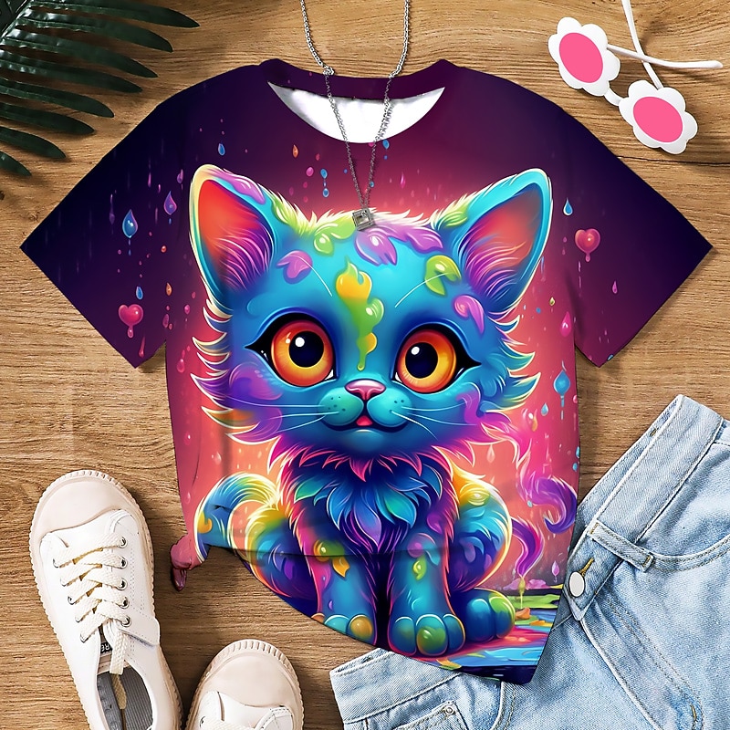Girls' 3D Graphic Cartoon Cat T shirt Tee Short Sleeve 3D Print Summer Spring Active Fashion Cute Polyester Kids 3-12 Years Outdoor Casual Daily Regular Fit 7