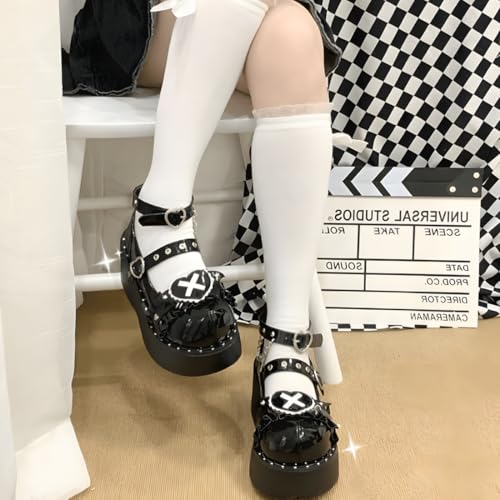 • Design: The mary jane shoes design with round toe, with white lace heart trim and rivet chain decor, perfect combination for any style outfits, such as casual outfits, cosplay, y2k clothes, kawaii clothes, gothic clothes, gyaru outfits, coquette outfits and lolita dress,etc.