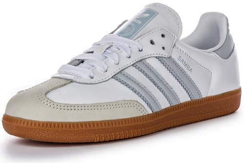 • CLASSIC DESIGN: Iconic Samba silhouette featuring white leather upper with grey stripes and signature T-toe overlay for authentic retro style