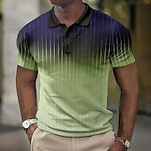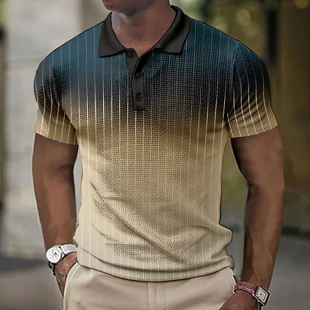 Highlights [Fabric] Crafted from a lightweight and breathable waffle fabric, this men's polo shirt ensures comfort throughout the day. The material's airy nature makes it an ideal choice for warmer weather, keeping you cool and at ease. [Fit] Designed with a sleek and modern silhouette, this short-sleeve polo shirt offers a flattering fit that suits a variety of body types. The gradient color scheme and vertical stripes enhance its sophisticated appearance. [Design Highlights] This polo shirt features a striking gradient transition from deep blue at the shoulders to warm beige at the waist, paired with classic vertical white stripes for a touch of elegance. The black polo collar with a two-button placket adds a traditional yet stylish element, while the 3D print design introduces a contemporary twist. [Occasions] Perfect for business casual settings, formal wear, workwear, and festival outings, this versatile shirt effortlessly transitions from a professional environment to a weekend gathering. Its sophisticated design makes it suitable for a wide range of events and occasions. [Size Range] Available in a wide range of sizes from S to 3XL, this polo shirt caters to different body shapes and preferences, ensuring a perfect fit for everyone.