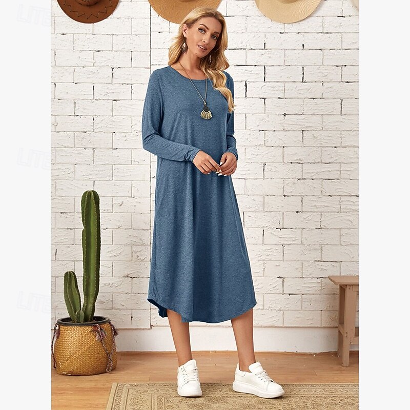 Women's Midi Dress T Shirt Dress Tee Dress Shift Dress Casual Boho Daily Sports Going out Loose Fit Plain Long Sleeve Crew Neck Black Red Blue Gray Spring Fall Winter Autumn 13