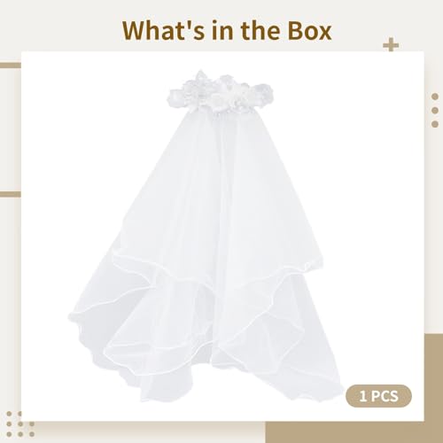 HOT ! Varku First Communion Veil,Girls Holy Communion Headpiece Flower Crown Veil,White Two-Layer Pearl Silver Sequins, 23.6" Length,Ideal for Communion Ceremonies,Elegant Headpiece for Ages 7-1