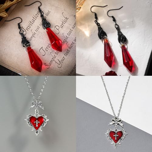 Gothic Bat Earrings and Vampire Necklace Set, Vampire Accessories Women, Halloween Jewelry with Choker, Black Dark Red Heart Pendant Costume Jewelry, Goth Witch Gift Collection. 7