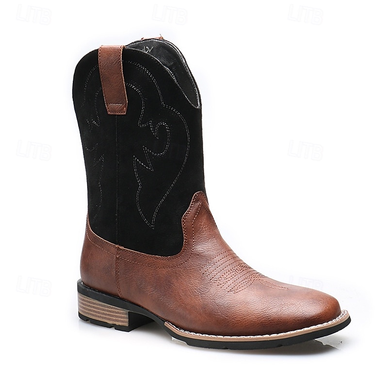 Men's Classic Cowboy Boots – Two-Toned Brown and Black Faux Leather with Distinct Stitching, Timeless Western Design for Casual Wear, Outdoor Adventures and Rodeo Events 1