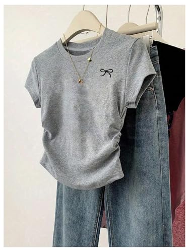 • Features: Short sleeve t-shirts, bow print, round neck, ruched, slim fitted t-shirts, 3 piece set