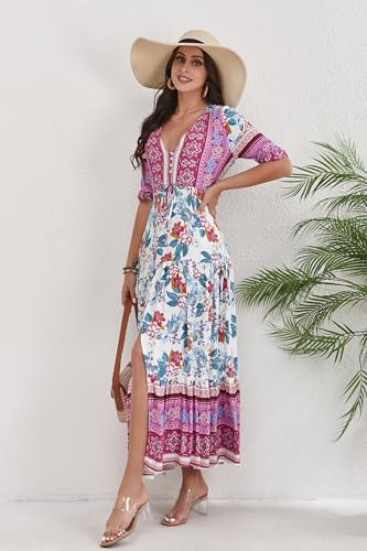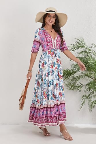 Women Short Sleeve V Neck Floral Print Casual Bohemian Maxi Dresses 6