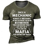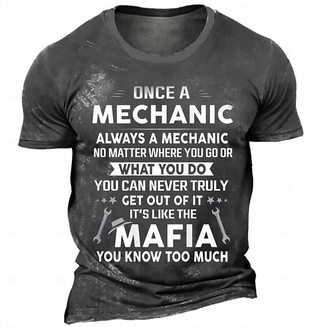 Highlights [Fabric] Crafted from a high-quality polyester blend, this men's T-shirt ensures a soft, breathable, and micro-elastic fit. Ideal for spring and summer, it guarantees comfort in various weather conditions. [Fit] Featuring a tailored fit, this short-sleeve T-shirt is designed to offer a sleek and stylish silhouette. The crew neckline complements the retro vintage style, making it perfect for casual and everyday wear. [Design Highlights] The standout feature of this T-shirt is its bold 3D printed graphic message, "Once a mechanic, always a mechanic..." which adds both humor and character. The faded black color gives it a trendy, lightly distressed look, while maintaining a classic appeal. [Occasions] Suitable for carnival parties, weekend gatherings, and various casual outings, this T-shirt is perfect for those who embrace a mechanic lifestyle or enjoy a touch of humor in their attire. It seamlessly fits into a variety of settings, adding a unique statement to any outfit. [Size Range] Available in a wide range of sizes, from S to XXXL, ensuring a suitable fit for diverse body types and personal preferences.