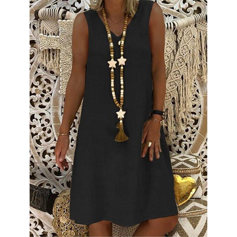 Highlights [Fabric] : Crafted from a high-quality blend of cotton and polyester, this women's sundress offers a lightweight and breathable feel, perfect for keeping cool and comfortable during spring and summer. The airy fabric ensures easy movement, ideal for warm weather activities. [Fit] : Designed with a regular fit, this sleeveless dress provides a relaxed and comfortable silhouette that's flattering for a range of body types. The mini dress length falls just above the knee, offering a modest yet stylish appearance suitable for casual wear. [Design Highlights] : Featuring a timeless V-neck and clean lines, the dress embraces a minimalist aesthetic that is both elegant and versatile. The plain pattern complements the simplicity of the design while the relaxed cut allows for effortless elegance. [Occasions] : This basic sundress is perfect for daily wear, vacations, and beach outings, making it a go-to choice for a variety of casual or leisurely occasions. Whether you're heading to a beach day or enjoying a sunny afternoon in the city, this dress combines style and comfort effortlessly. [Size Range] : Available in a wide range of sizes from S to 5XL, this sundress is designed to accommodate diverse preferences and body types, ensuring a great fit for many women seeking both comfort and style.