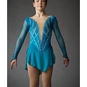 More information about Figure Skating Dress Women's Girls' Ice Skating Dress Lake Blue Patchwork Thumbhole Mesh Spandex Stretchy Training Practice Professional Skating Wear Thermal Warm Crystal / Rhinestone Long Sleeve Ice