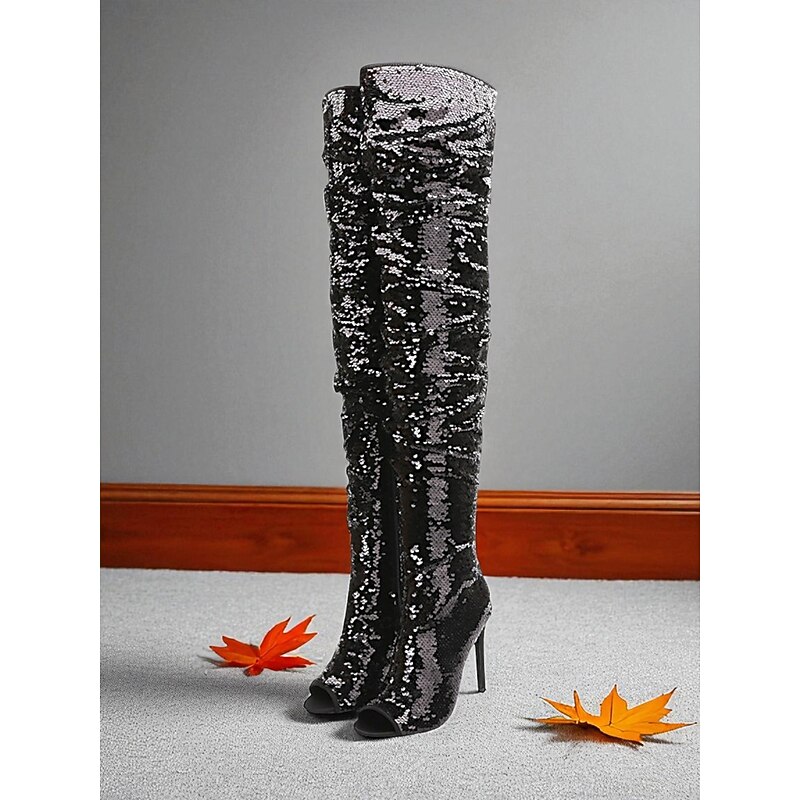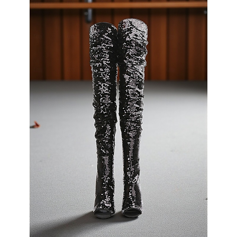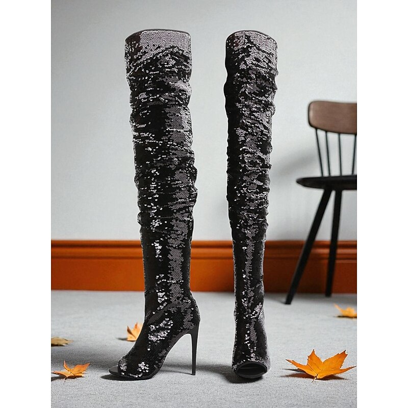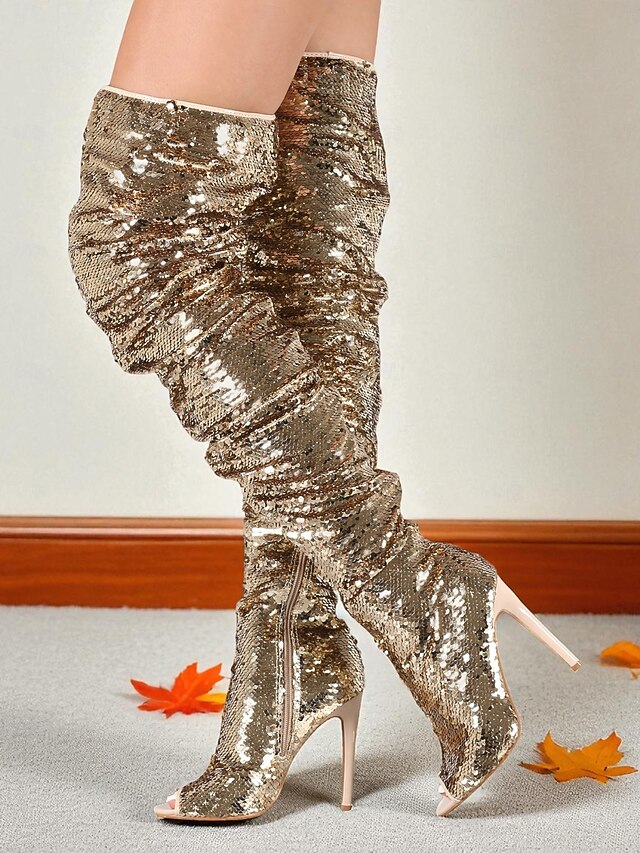 More information about Women's Gold Sequin Thigh High Boots - Glamorous Peep Toe Stiletto Heels for Nightlife & Party Outfits