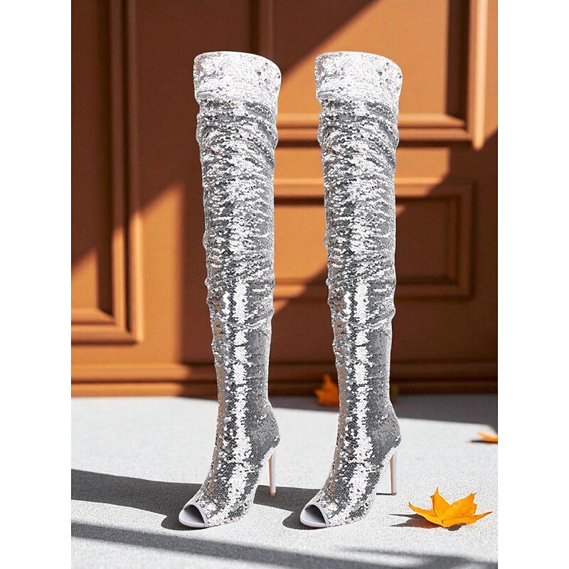 HOT ! Women's Gold Sequin Thigh High Boots - Glamorous Peep Toe Stiletto Heels for Nightlife & Party Outfits