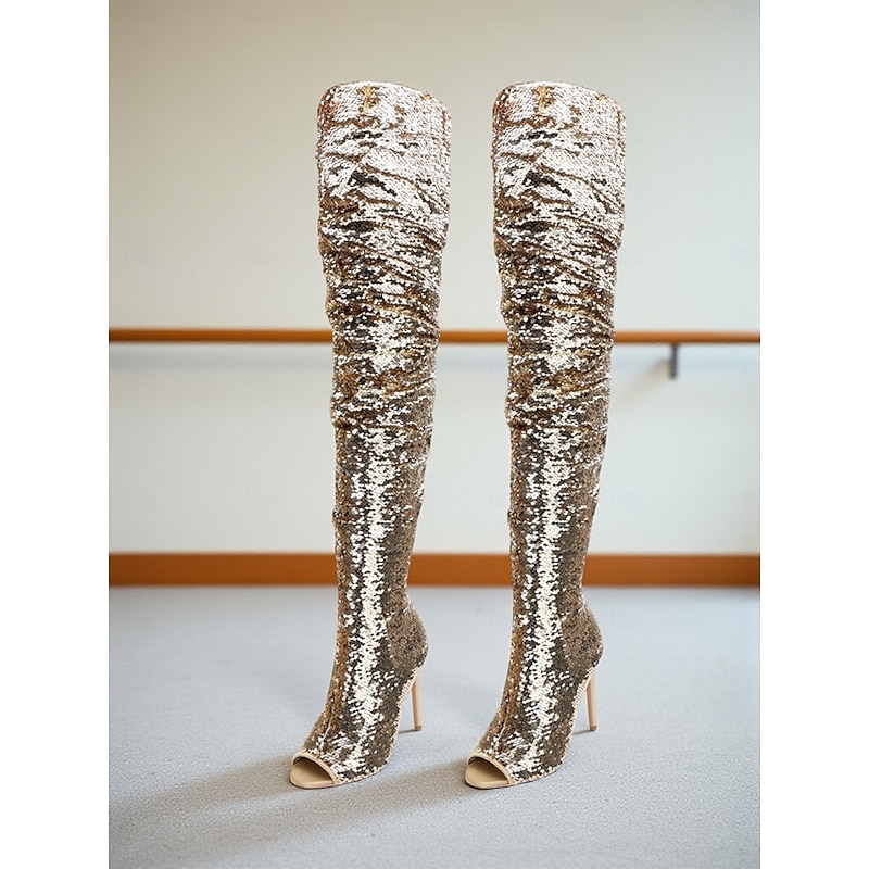 Women's Gold Sequin Thigh High Boots - Glamorous Peep Toe Stiletto Heels for Nightlife & Party Outfits 2