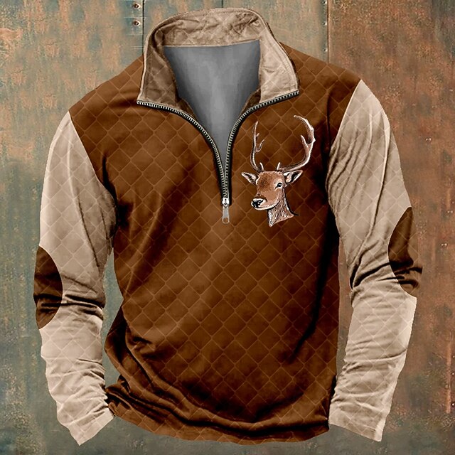 Men's Patchwork Deer Sweatshirts Sweatshirt Zip Sweatshirt Quarter Zip Sweatshirt Long Sleeve Sweatshirt Crew Neck Quarter Zip 3D Funny 3D Print Christmas Party Holiday Crewneck Half Zip Winter 3