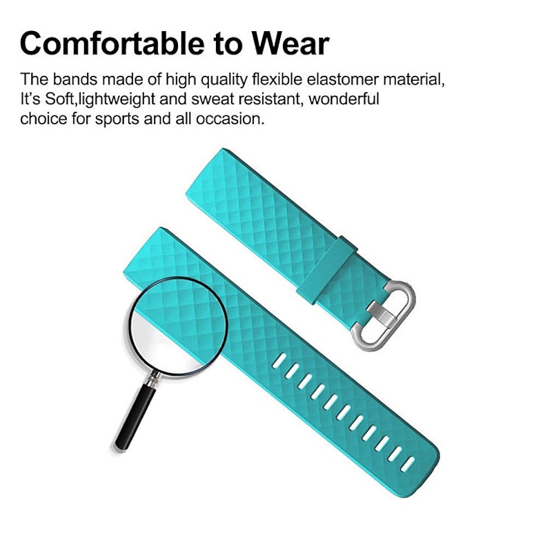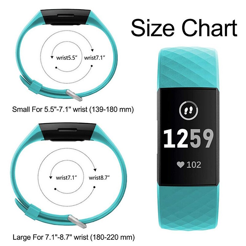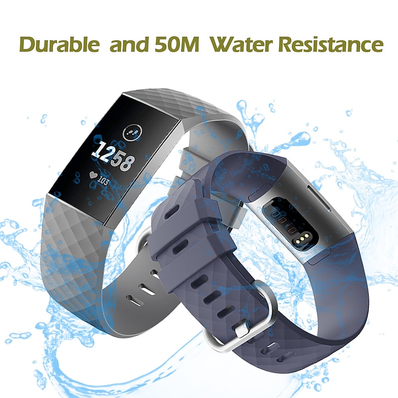 Highlights 1. Achieve a fitness look with our specially designed bands for Fitbit Charge 4 and Charge 3/SE (Tracker not included). 2. Made of high-grade skin-friendly and odorless silicone, our bands are both dirt-proof and water-resistant, ensuring breathability and comfort around your wrist. 3. Personalize your Fitbit Charge 4 tracker with our various colors and two sizes available for both men and women. The small size fits wrist sizes 5.5"-7.1" while the large size fits wrist sizes 7.1"-8.7". 4. Our bands are crafted from premium waterproof material, a flexible elastomer that is sweat and water-resistant. Lightweight and easy to dry, they are perfect for activities like swimming. Additionally, the durable material prevents skin irritation, making them incredibly soft and comfortable to wear.