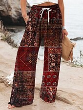 More information about Women's Wide Leg Chinos Baggy Pants Vacation Vintage Fashion Full Length High Waist Graphic Geometric Drawstring Patchwork Printing Soft Breathable Micro-elastic Vacation Causal Casual Maroon Summer