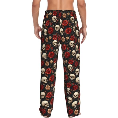 HOT ! Mens Pajama Pants - Red Rose Skull Print Soft Sleep Lounge Pants For Men, Casual Pj Bottoms With Pockets