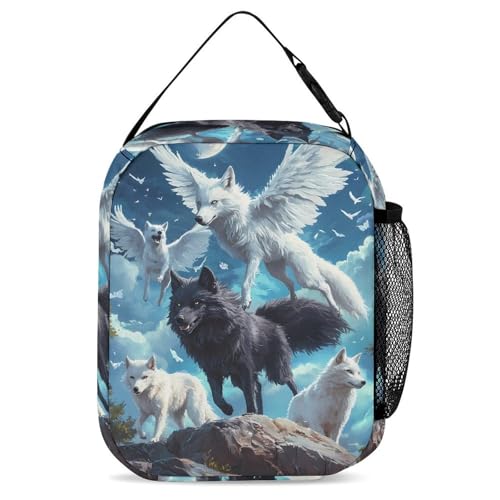 Wolf with Wings Under Moon Funny Backpack Sets Lightweight 3Pcs Daypack Set with Lunch Box And Pencil Case for Women Men 4