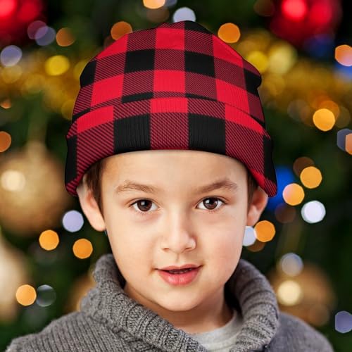 Red and Black Buffalo Plaid Kids Beanie Hat for for Girls Boys Children Cap Winter Knitted Chemo Cancer Headwear Accessories Gifts Decoration 1