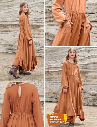 Jxstar Girls Boho Dress Casual Long Sleeve Maxi Dresses Crew Neck Ruffle Flowy Swing Long Dress with Pockets 5