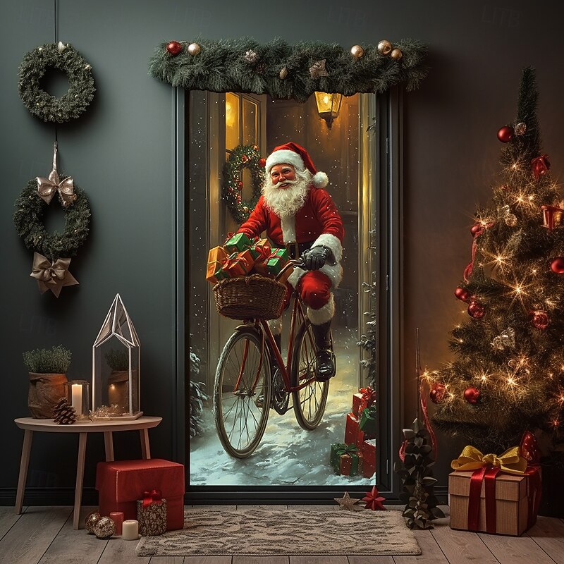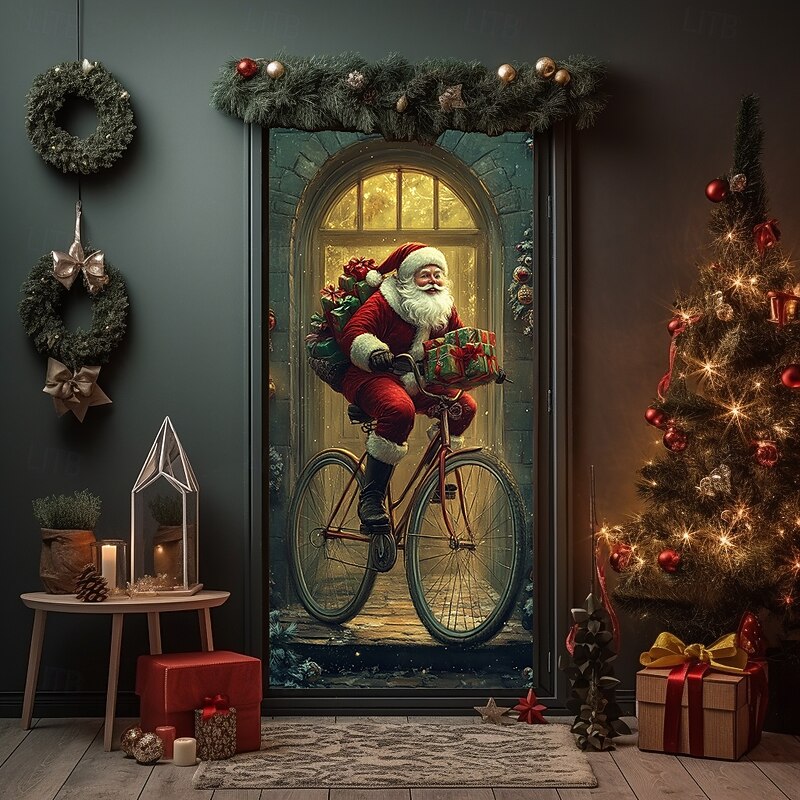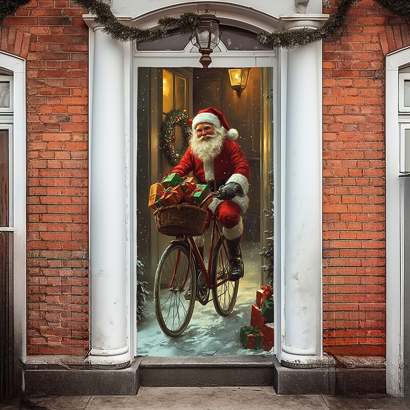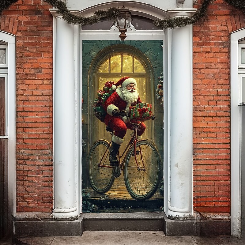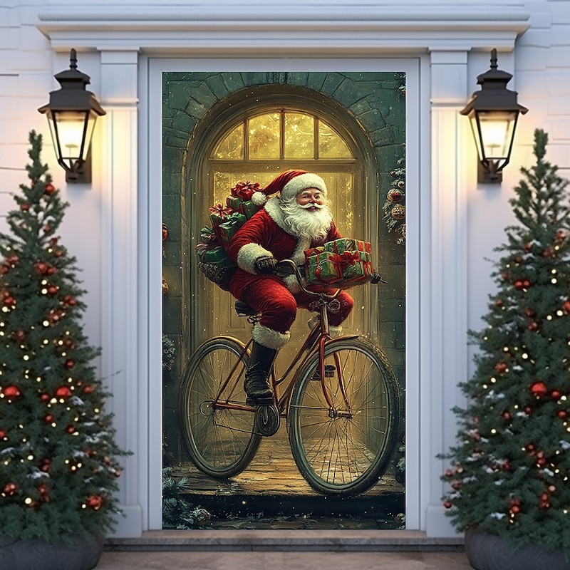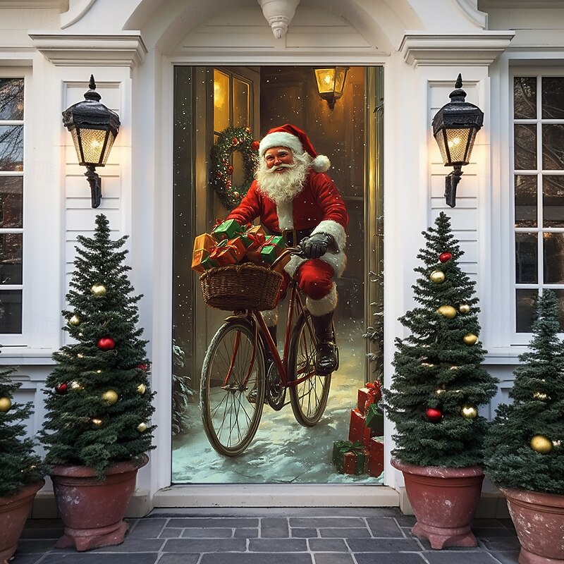 HOT ! Christmas Door Decorations Door Covers Xmas Santa Cycling Door Tapestry Door Curtain Decoration Backdrop Indoor/Outdoor Door Banner for Front Door Farmhouse Christmas Holiday Party Decor Supplies