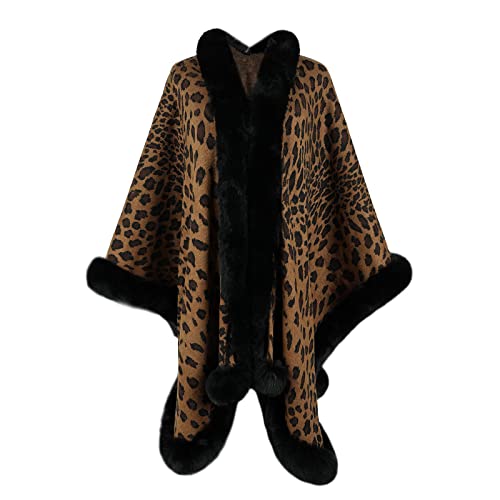 Faux Fur Shawl Wrap Womens Leopard Cape with Fur Trim Coat Bridesmaid Bolero Woolen Shrug Evening Dress Winter 1