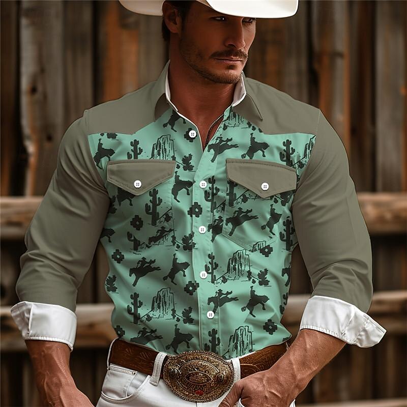 More information about Men's Cowboy Western Shirt Button Up Shirt Cowboy Shirt Long Sleeve Vintage Western Style Daily Wear Weekend Spring Fall Winter Turndown Collared Shirts 3D Print Front Pocket Blue Brown Khaki