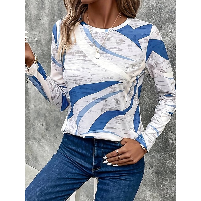Highlights [Fabric] : Crafted from a soft, polyester blend, this women's long-sleeve top offers a comfortable and slightly stretchy feel, ensuring all-day comfort and durability. The material's quality allows for easy care and maintenance, with options for machine wash and dry cleaning. [Style] : The top features a relaxed, regular fit that flatters various body types, providing both ease and style. Its long sleeves and classic crew neck make it a versatile piece that transitions seamlessly between different looks. [Design Highlights] : The standout feature of this top is its dynamic geometric print in a vibrant blue shade, adding a touch of modern flair. The abstract pattern creates visual interest while maintaining a casual yet chic aesthetic, perfect for elevating your everyday wardrobe. [Occasions] : This casually stylish top is ideal for a range of activities, from daily wear and casual outings to relaxed weekends at home. Pair it with jeans or leggings for an effortlessly put-together ensemble. [Size Range] : Available in sizes S to 2XL, this top caters to a wide variety of fits, allowing for a perfect choice whether you prefer a snug or slightly looser style.