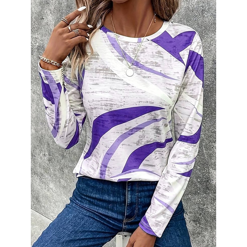 Women's T shirt Long Sleeve Crew Neck Long Sleeve Tunic Casual Print Regular Tops Daily Blue Purple Khaki Spring Fall Prefall 1