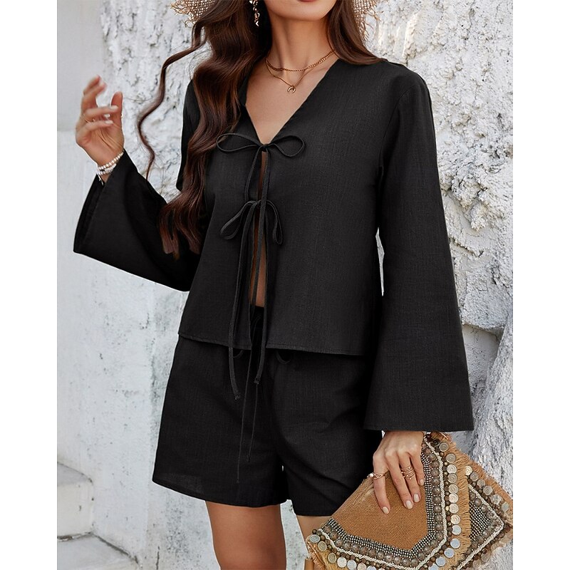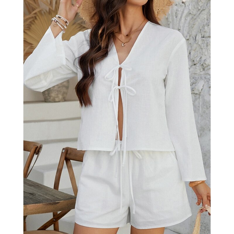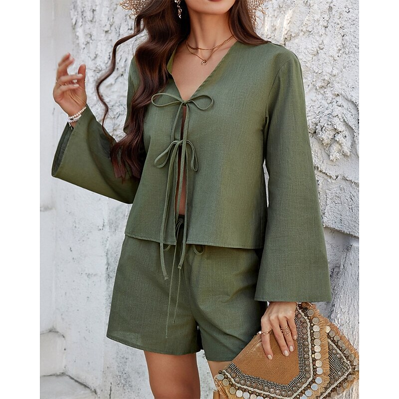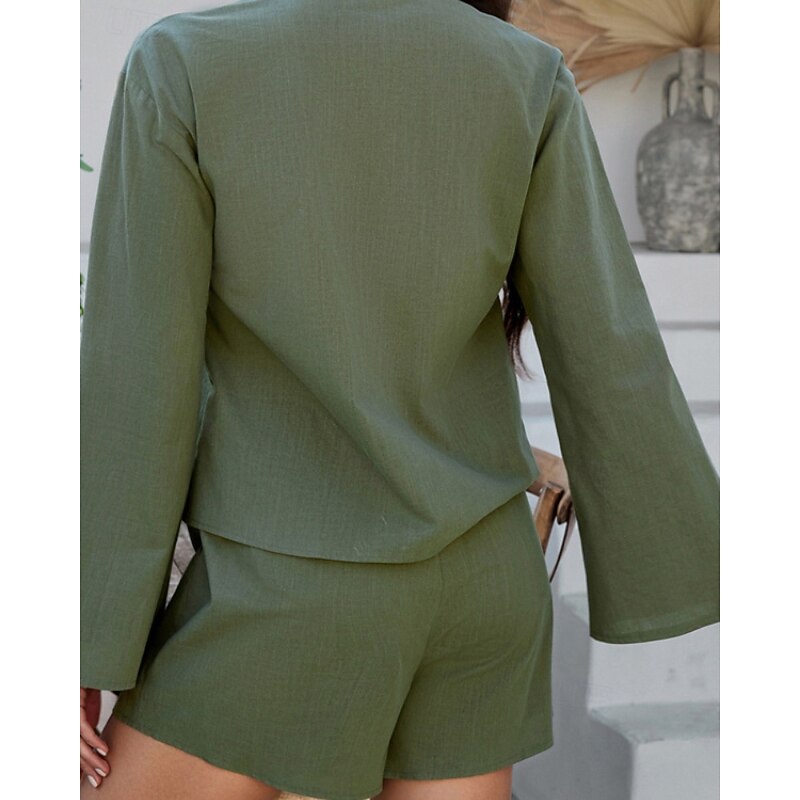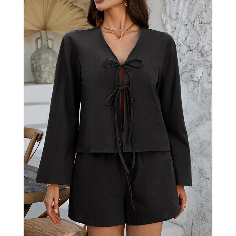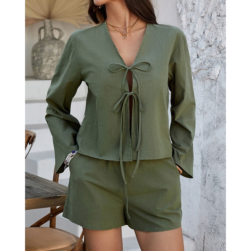 More information about Women's Active Fashion Blouse Shorts Sets Long Sleeve V Neck Solid Color Lace up Daily Casual Daily Black White Army Green Summer Regular Fit