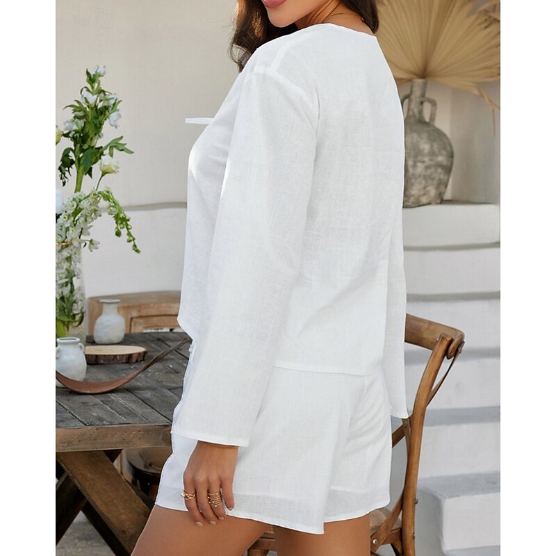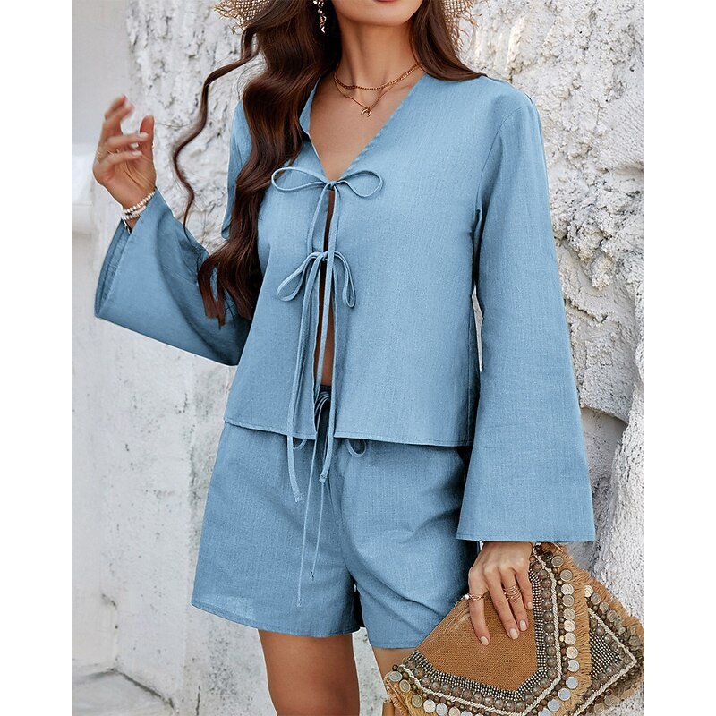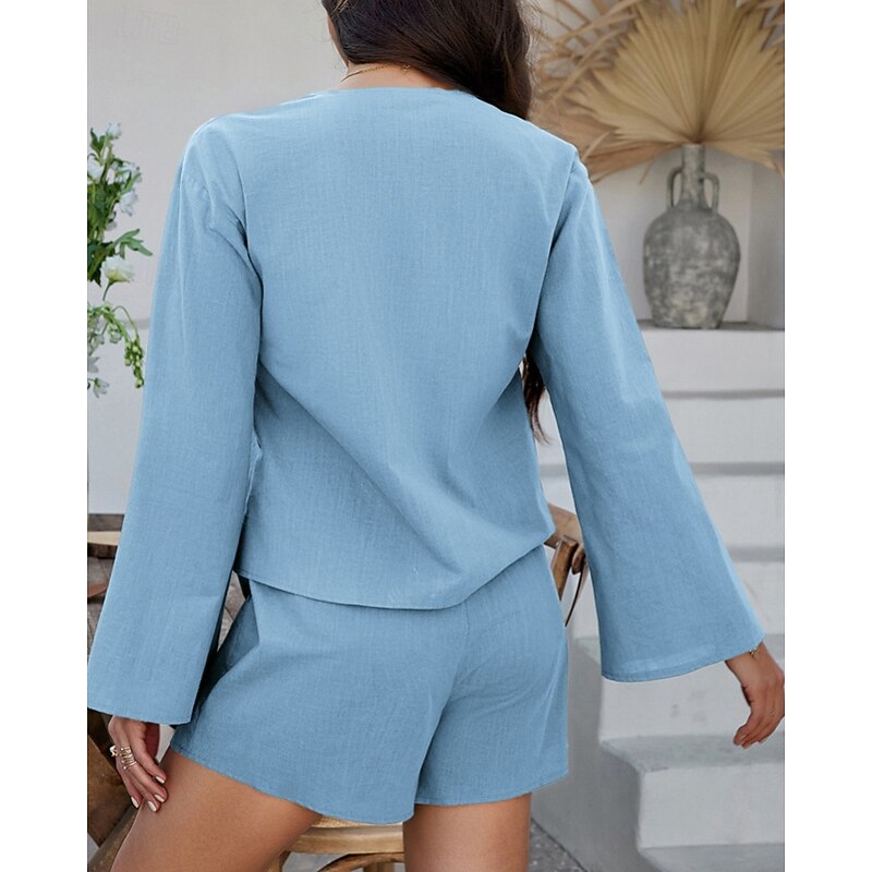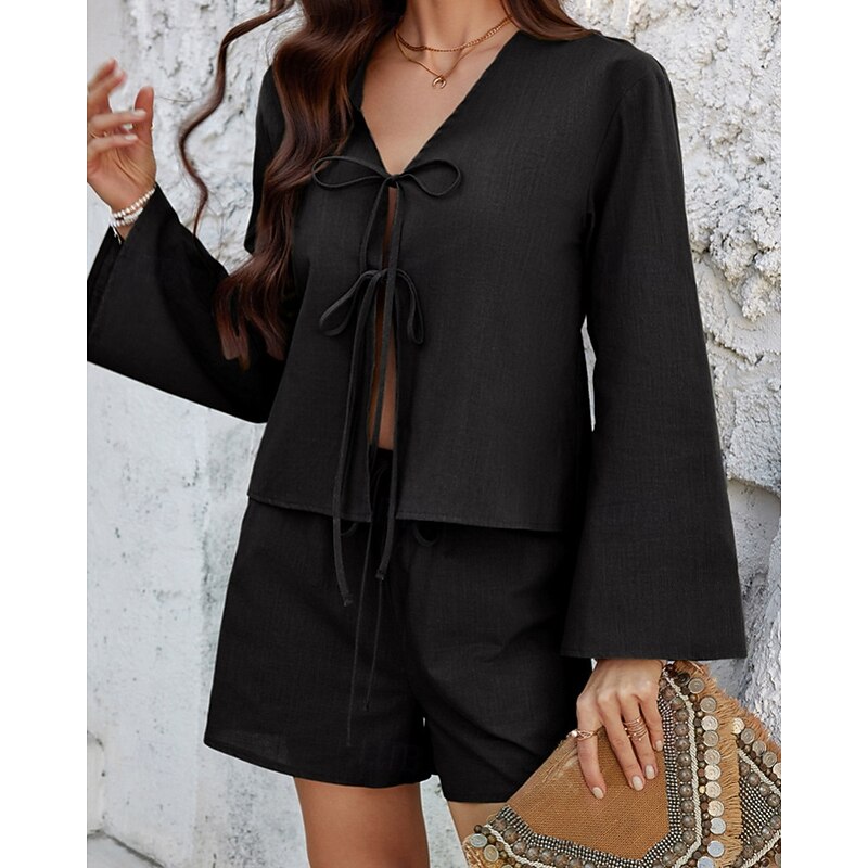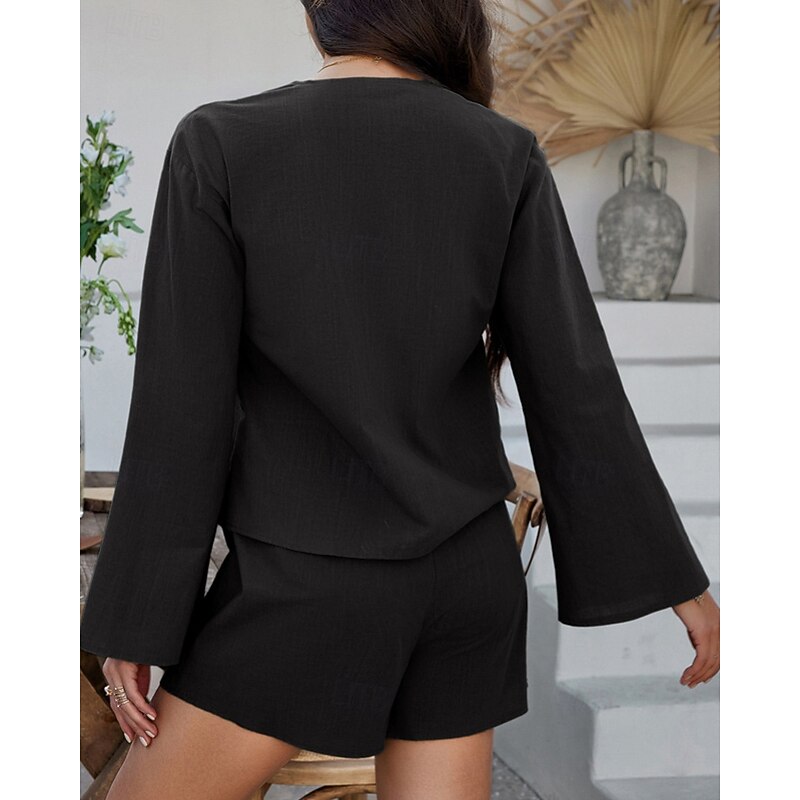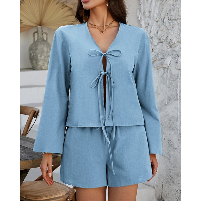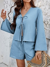 More information about Women's Active Fashion Blouse Shorts Sets Long Sleeve V Neck Solid Color Lace up Daily Casual Daily Black White Army Green Summer Regular Fit