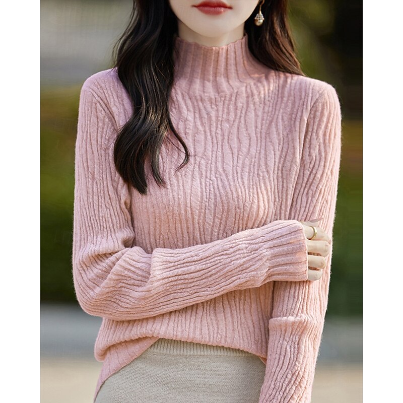 Women's Sweater Pullover Streetwear Casual Solid Color Mock Neck Knitted Long Sleeve Regular Tops Knit Daily Holiday Going out White Pink Fall Winter 11
