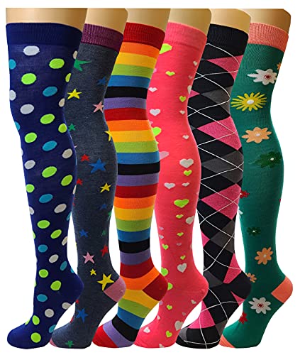 SUMONA 6 Pairs Pack Women Multi Neon Color Fancy Design Thigh High Over the Knee Socks Stockings 7