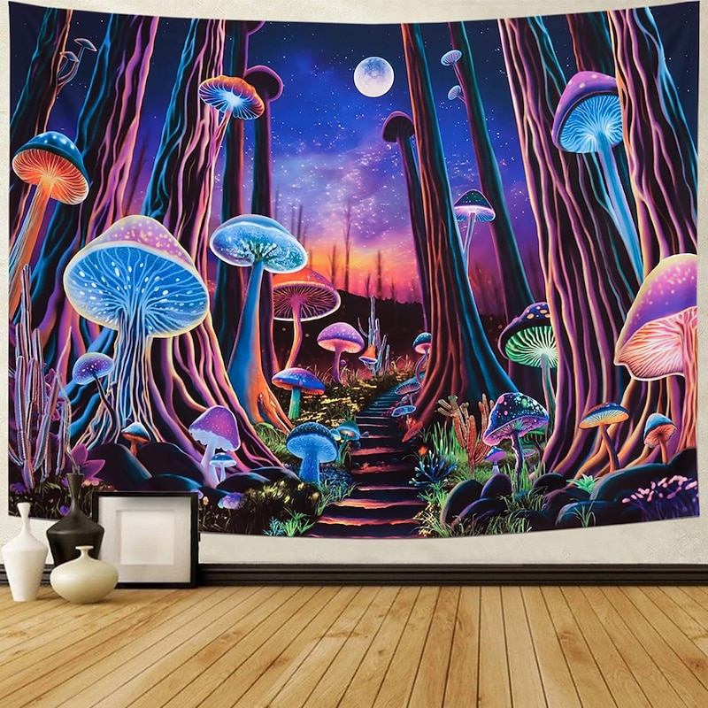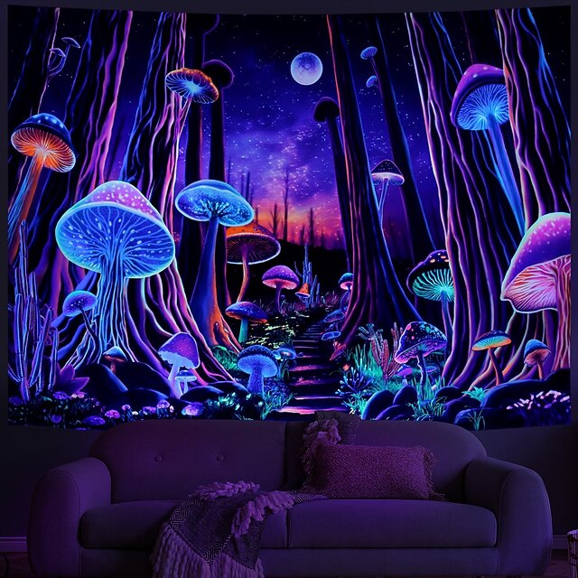HOT ! Mushroom Fantasy Blacklight Tapestry UV Reactive Glow in the Dark Glow Party Trippy Misty Nature Landscape Hanging Tapestry Wall Art Mural for Living Room Bedroom