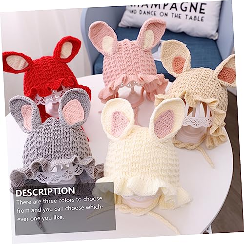 VICASKY Knitted Yarn Hat with Rabbit Ears Adjustable Lacing Thick Warm Beanie for Months to Years Breathable Thermal Winter Bonnet with Lotus Leaf Edge Beige 3