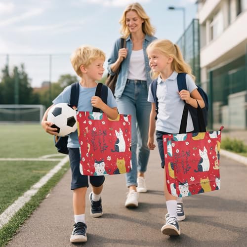 HOT ! Kids Book Tote for Kids Boys Girls, Cartoon Funny Cat Red Sturdy Library Book Tote Shopping Bag with Zipper Handles for School Shopping Beach Rainbow