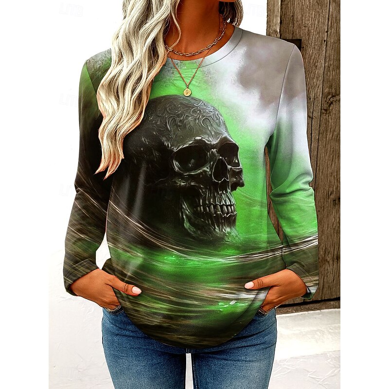Halloween Women's T Shirt Skulls Graphic Vintage Fashion Stylish Long Sleeve Crew Neck Regular Tops Daily Weekend Print Blue Purple Green Gray Spring Fall Winter 7