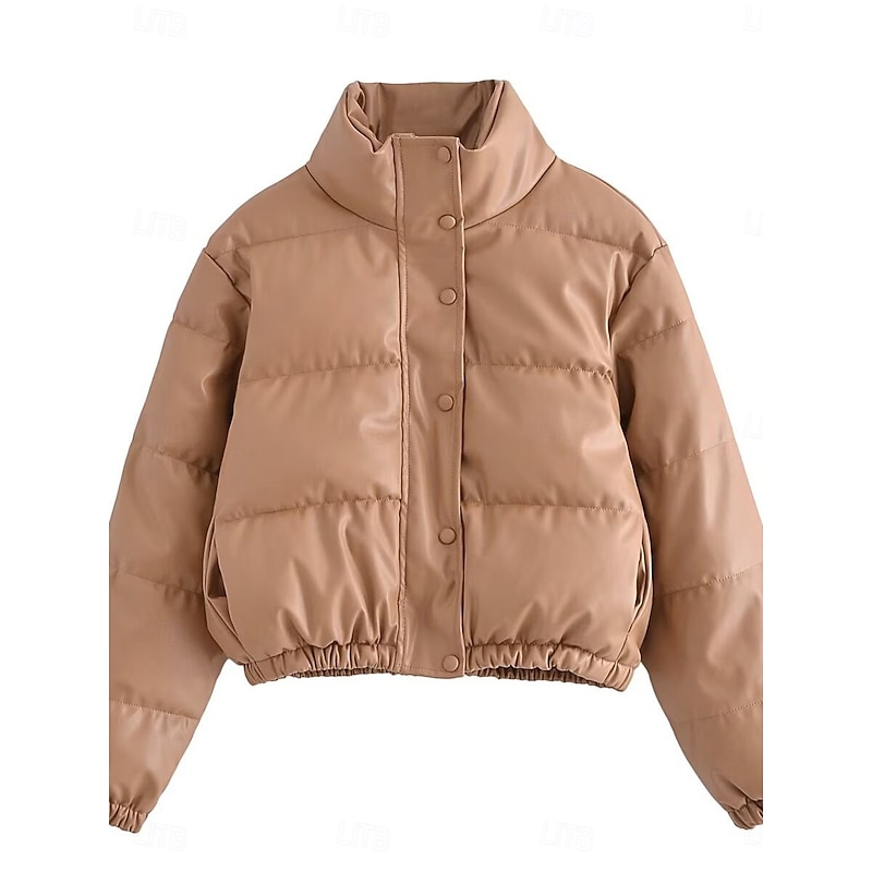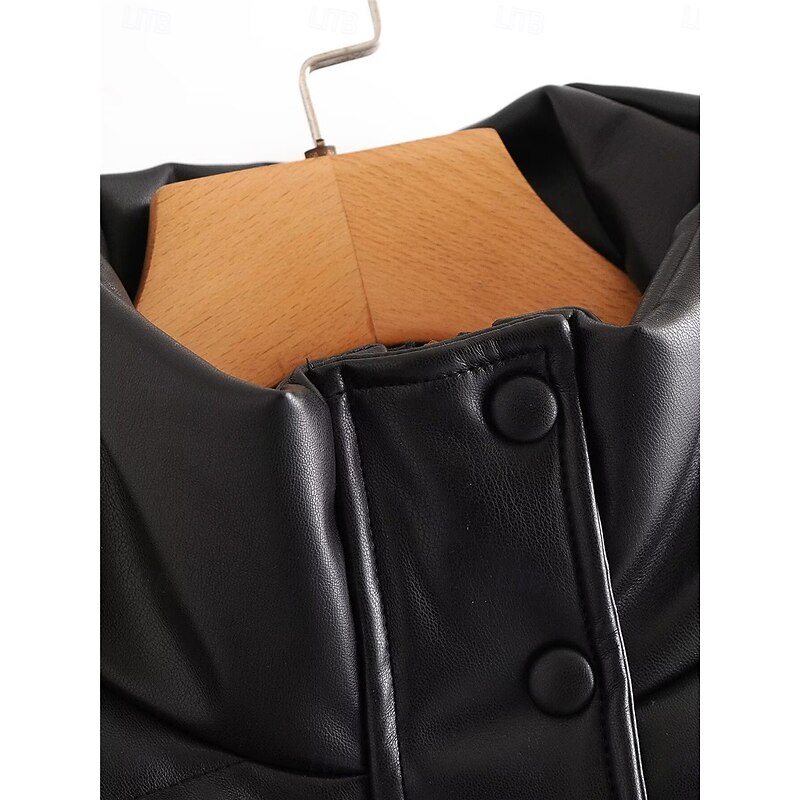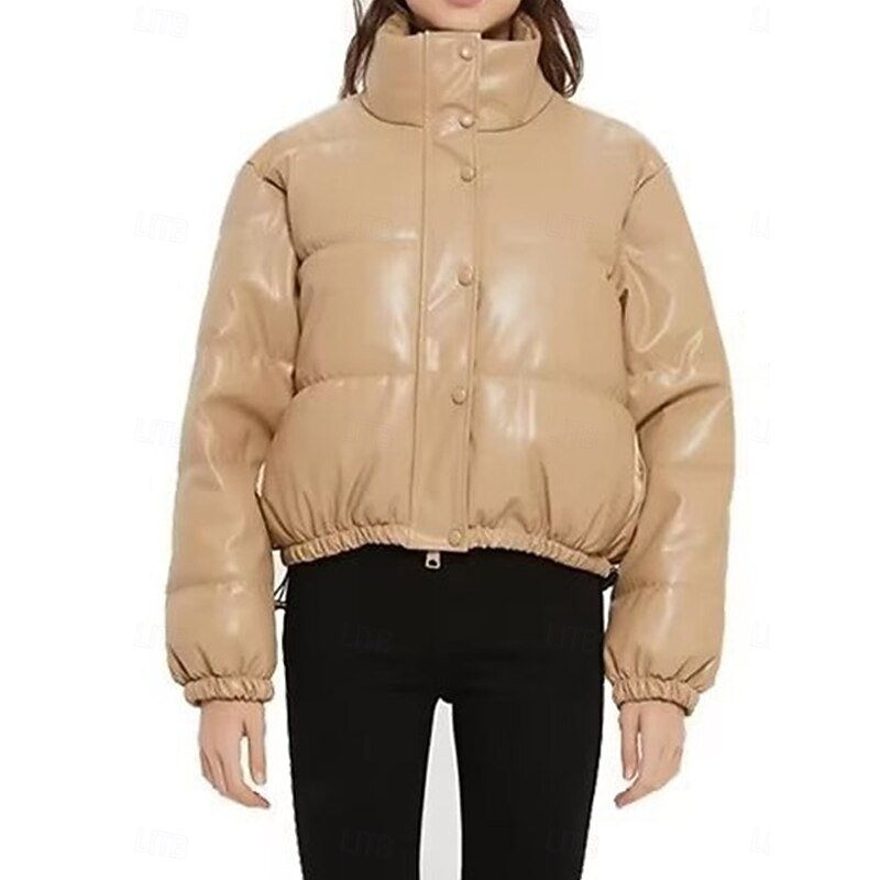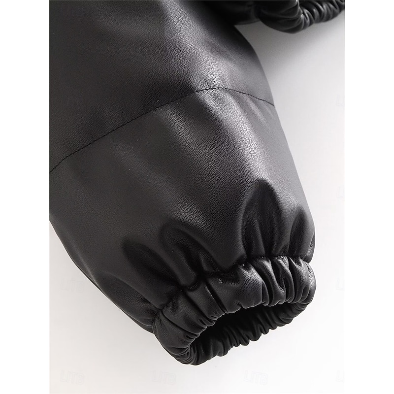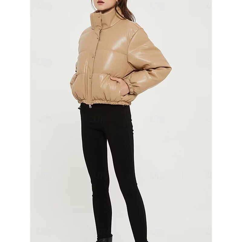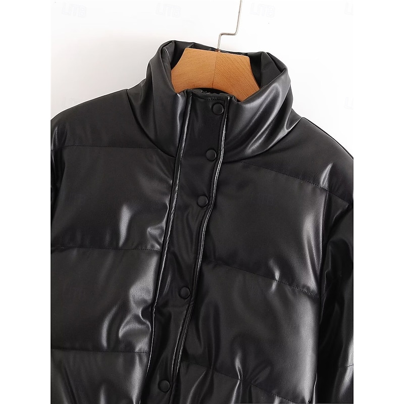 Crafted from high-quality polyester, this women’s puffer jacket features a sleek, shiny finish that mimics the look of leather, offering both a modern aesthetic and practicality. The micro-elastic fabric ensures comfort and slight stretch, perfect for seasonal wear.