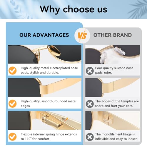 • HIGH QUALITY: This stylish pair of oval sunglasses is made with high-quality metal frames and TAC polarized lenses. Selected lightweight, soft nose pads The durable metal spring hinges on the temples provide flexibility and comfort, Combined with ergonomic design, they mold to the contours of your face, making you feel comfortable and at ease no matter how long you wear them.